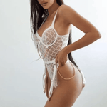 WILD Hvit er et ikonisk plagg som forener raffinement og strålende sensualitet. Den hvite grafiske tyllen, de sølvfargede metallkjede og de satinerte stroppene skaper en skulptural og uimotståelig elegant silhuett. Et plagg for de som elsker luksus, detaljer og en forførelse som aldri unnskylder seg.
