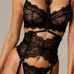 Strålende karisma Dykk inn i den mystiske auraen av vårt MOON Svart-sett. Denne kreationen av fem deler, helt laget av svart blomsterspiss, er en hyllest til raffinert eleganse. Den dristige halsringen og den formende strømpeholderen smelter sammen for å skape en forførende silhuett som lover et uimotståelig utseende.