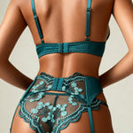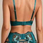 Den dype smaragdgrønne fargen og de isblå blomsterbroderiene på gjennomsiktig tyll forvandler undertøyet til et ekte kunstverk.