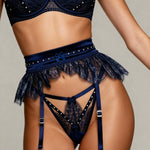 Skulpturell og fascinerende, er dette femdelt sett pyntet med fine krystaller på BH-koppene, trusen og strømpeholderen.