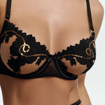 Oppdag det fire-delte undertøysettet - ASTRIA fra NAKED Underwear, en luksuriøs kreation laget av delikat tyll, dekorert med svart, floral blonder. Dette mesterverket skiller seg ut med sine gyldne bånd som med eleganse er fordelt over hele settet og gir en uovertruffen eleganse. Akkompagnert av matchende lårbånd, er dette settet inkarnasjonen av luksus og forførelse.