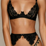 Settet ADAGIO Noir er vår sanne favoritt og etablerer seg som den foretrukne gaven i høytiden. Dets delikate smykker på stroppene til BH-en og detaljene på stringtrusen gir dette sensuelle stykket en uimotståelig glans. Subtilt dristig, luksuriøst raffinert, kler det hver kurve med eleganse for en uforglemmelig effekt.