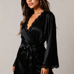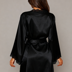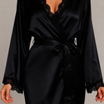 SOELIS gjenoppfinner kimonoen. Den svarte satinen glir over huden din. Spissen rammer inn utringningen med delikatesse. Ermene ender i raffinerte avslutninger. Satinbeltet binder midjen din. Dette er ikke en vanlig kimono. Dette er klassikeren du har ventet på.
