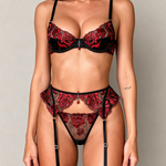 Orée ligner ingenting du kjenner. Røde rosebroderier blomstrer på svart tyll. Små juveler glitrer mellom brystene dine og på hoftene dine. Hvert detalj forteller en historie. Historien om en kvinne som tør, uten å tvinge. Som forfører, uten å skrike. Det er ikke et sett. Det er en erklæring.