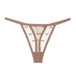 Velora er laget av ultrafin mesh, brodert med sommerfugl-inspirerte motiver som stryker over huden som en hvisking. Den minimale string-silhuetten glatter ut hoftene dine og forsvinner under klær — grafisk, nesten usynlig, og laget for å fremheve.
